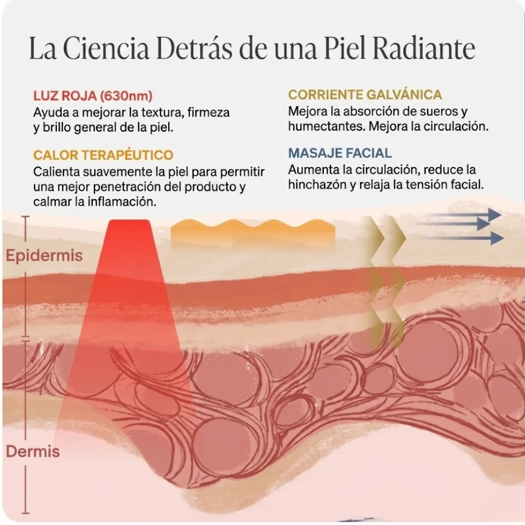 La terapia de luz roja es una tecnología de cuidado facial que utiliza luz suave para estimular la piel, favoreciendo la producción de colágeno y la regeneración cutánea. Es un método no invasivo que acompaña de forma natural las rutinas de skincare modernas.